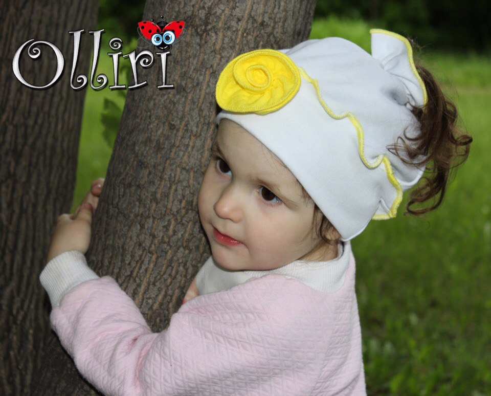 Цвет шапки белая (обработка и цветок : голубой , синий , светло-желтый , ярко желтый , розовый , зелёный , красный)