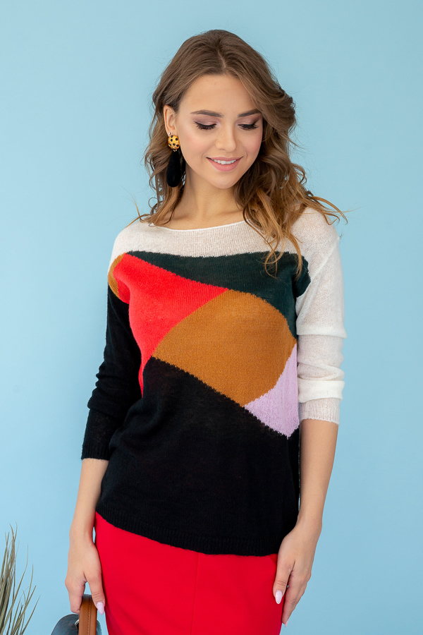 Вязаный джемпер выполнен из мохеровой нити (высококачественное европейское сырьё) с вывязанным контрастным узором. Рукав втачной в спущенную пройму. Размер S-соответствует 42-44